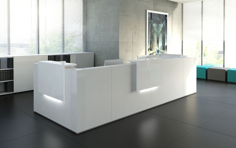 Elementul decorativ de pe blatul superior al receptiei Tera este din HPL lucios de culoare: alb, negru sau gri antracit, cu lumina LED alba dedesupt.