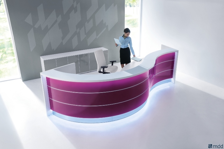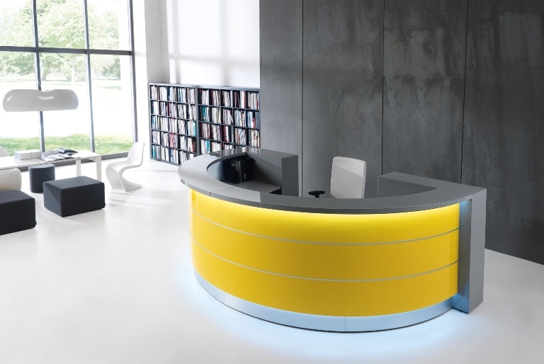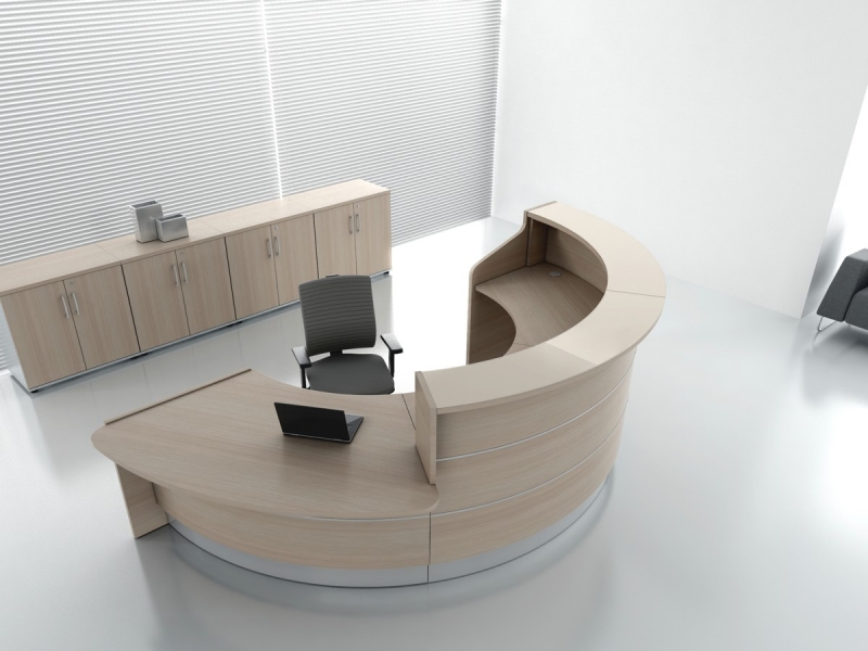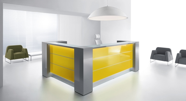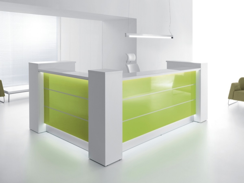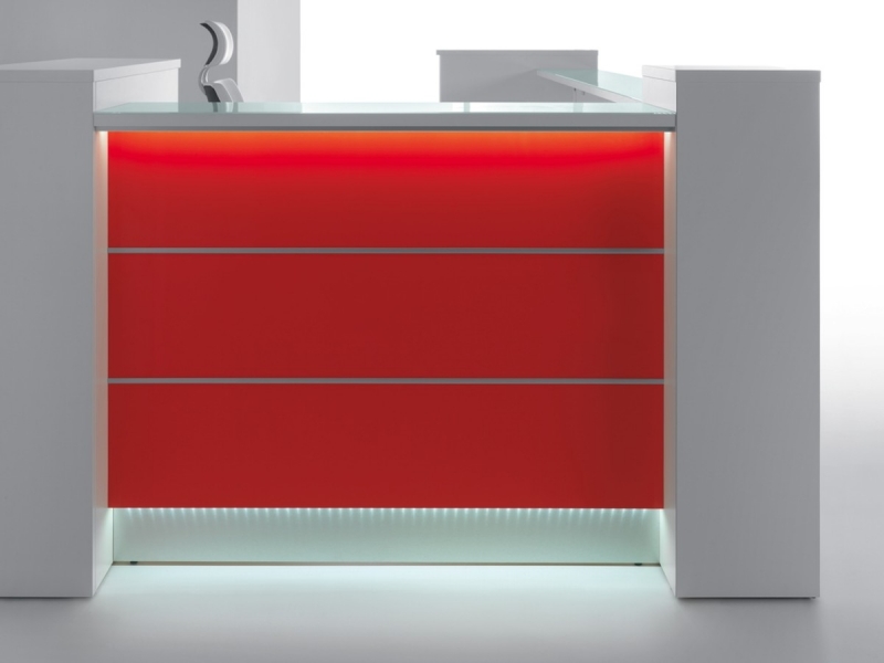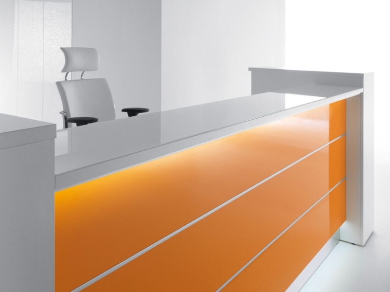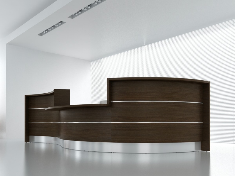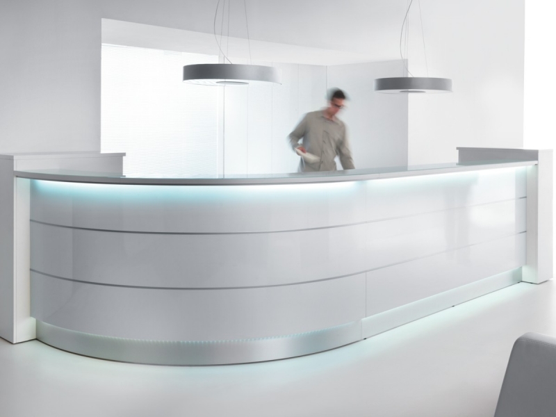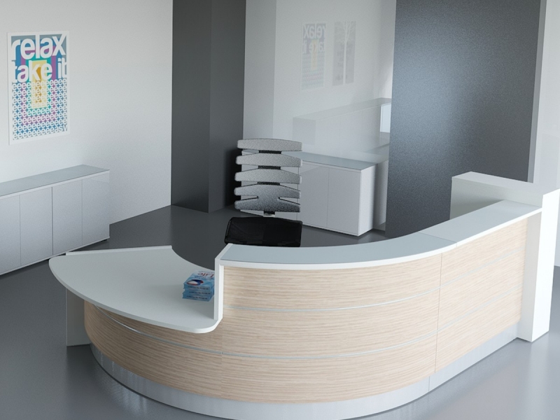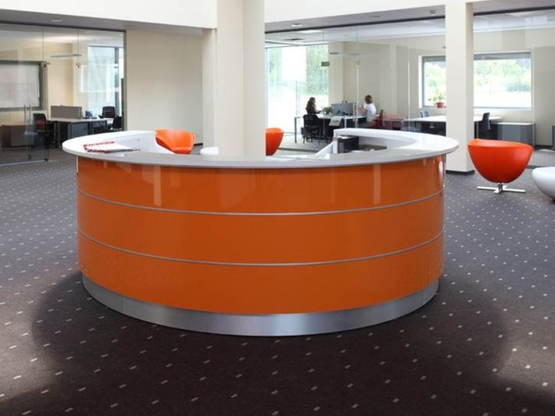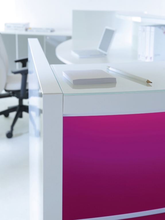 Frontul receptiei Valde este realizat din HPL colorat decorat cu benzi de aluminiu grosime 9mm. Fiecare blat de lucru este dotat cu trecere de cablu ø80mm.