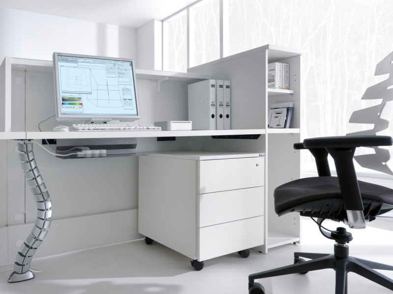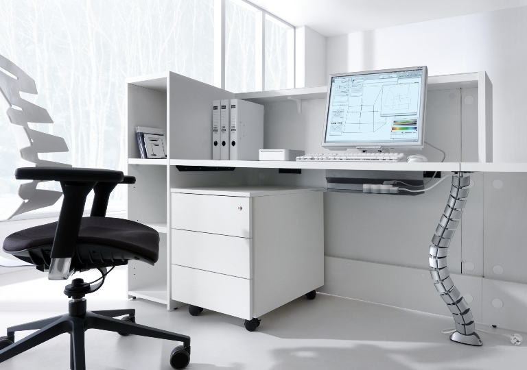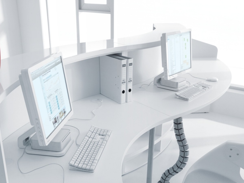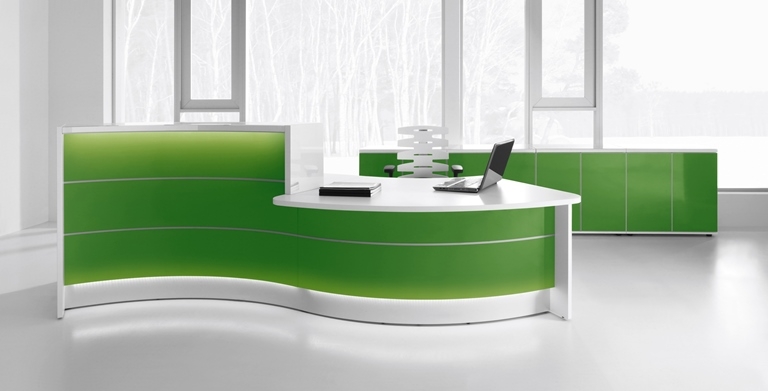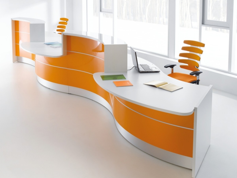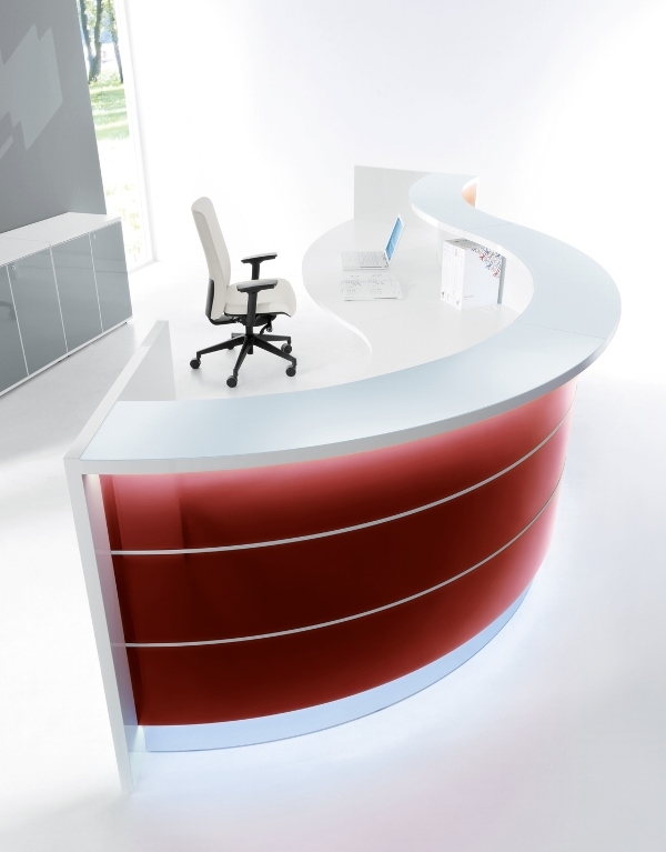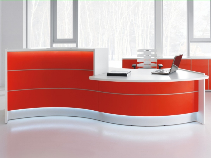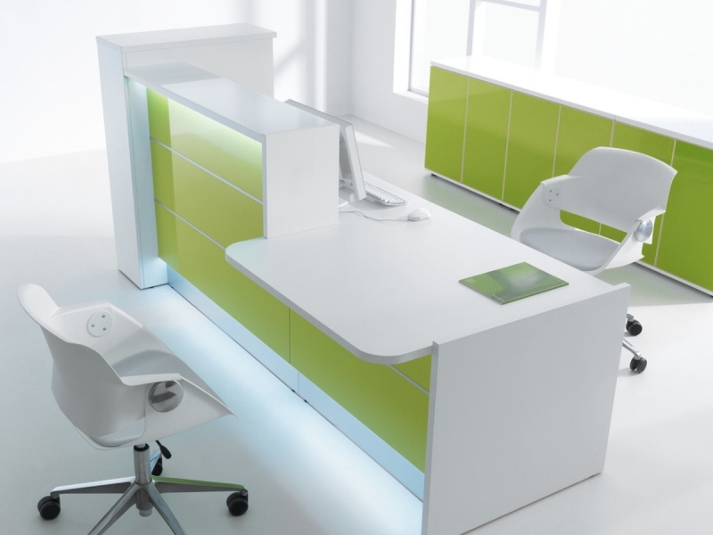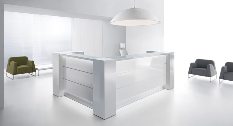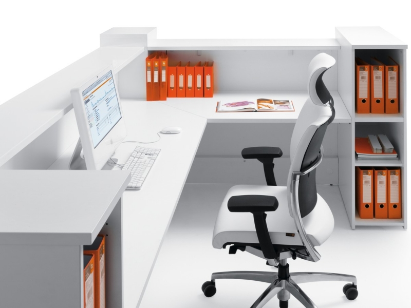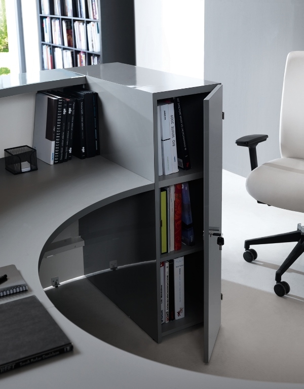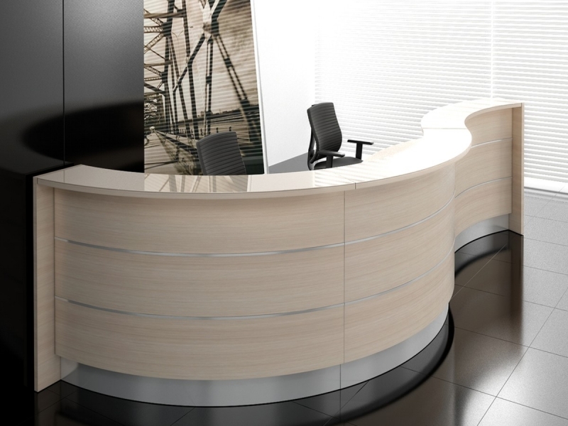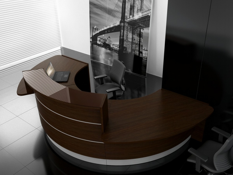 Frontul receptiei Valde este realizat din HPL colorat decorat cu benzi de aluminiu grosime 9mm. Fiecare blat de lucru este dotat cu trecere de cablu ø80mm.