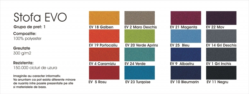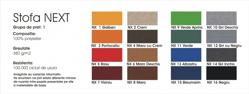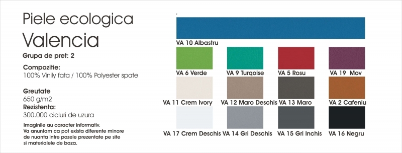 Sezutul si spatarul scaunului sunt tapitate cu piele naturala, piele ecologica, stofa sau lîna intr-o varietate mare de culori.